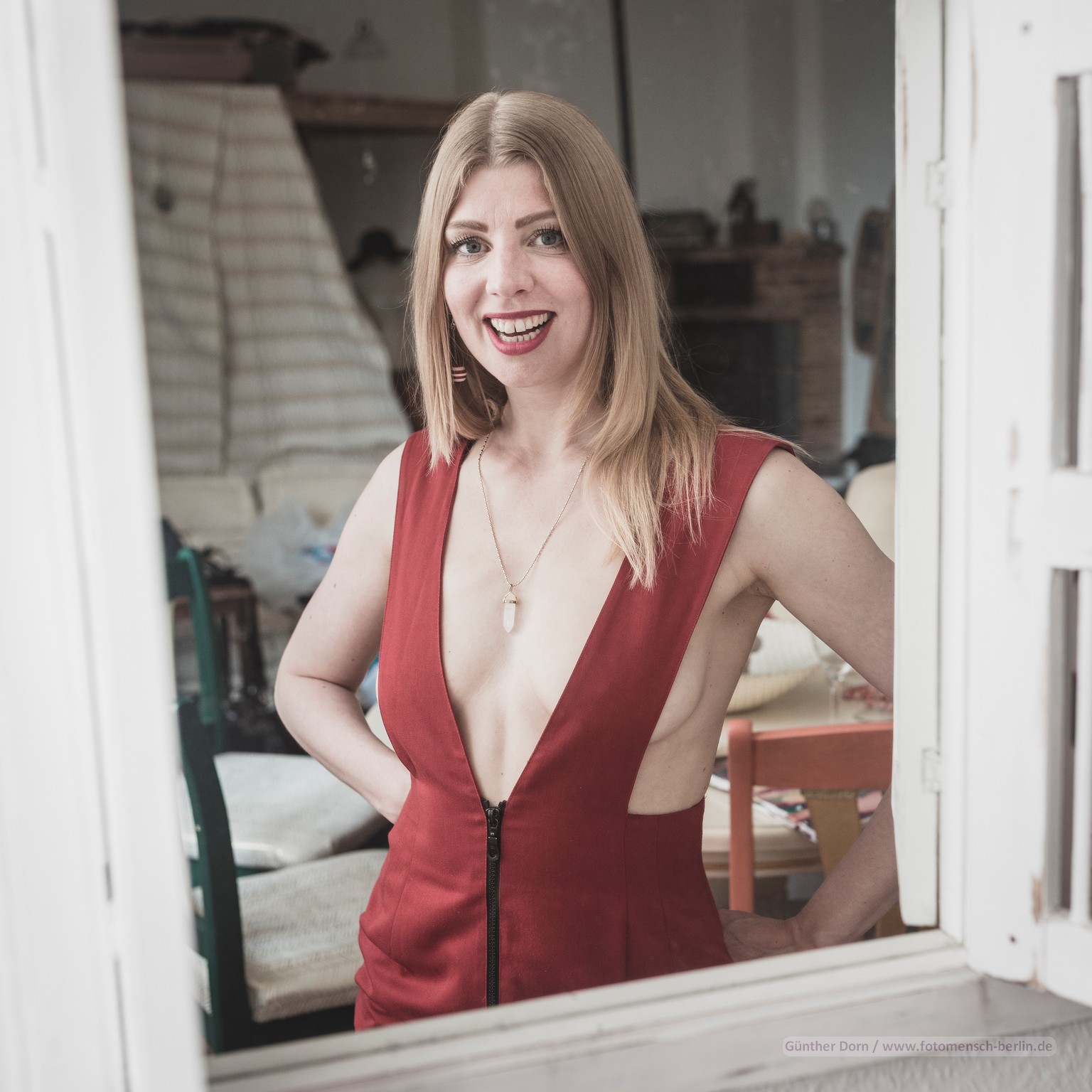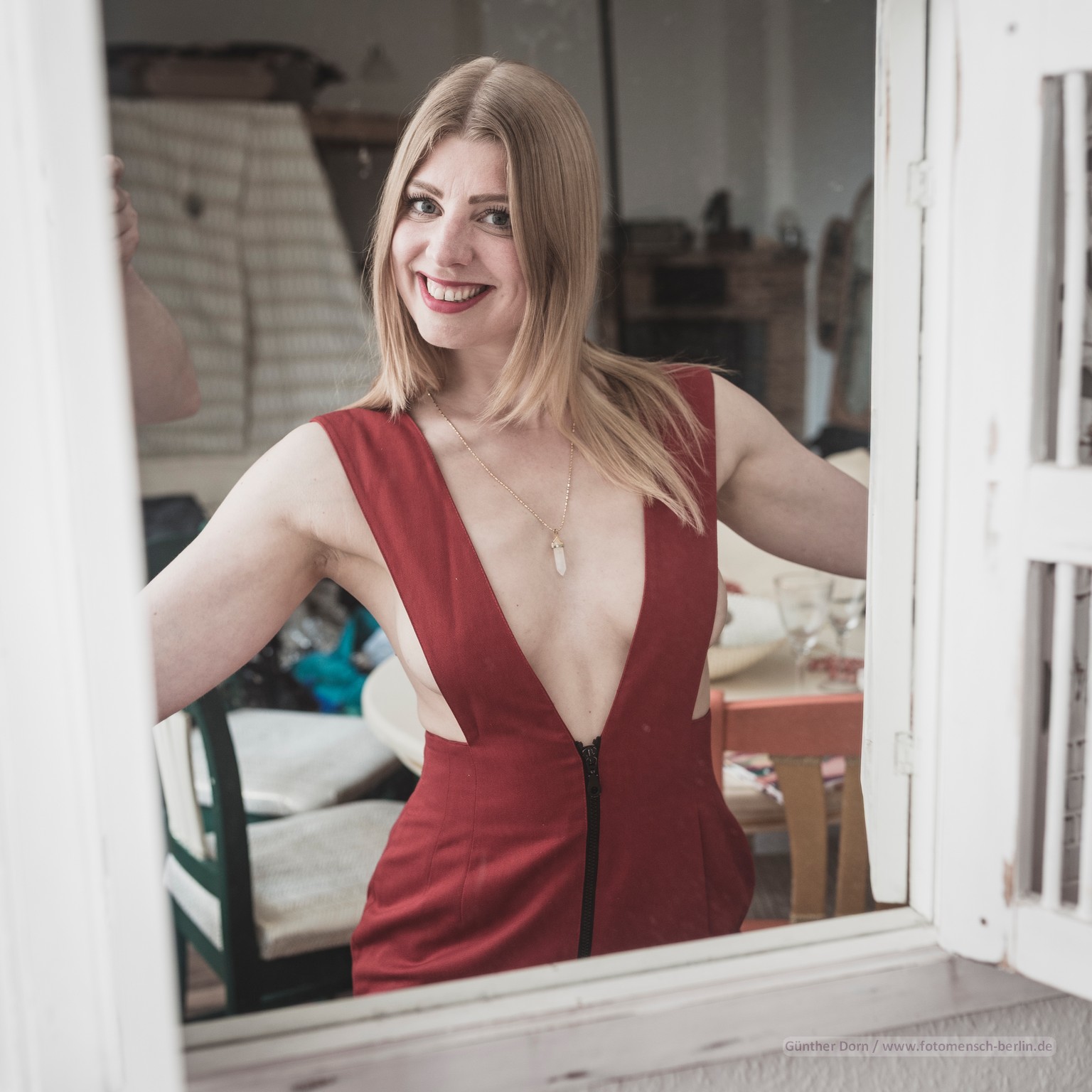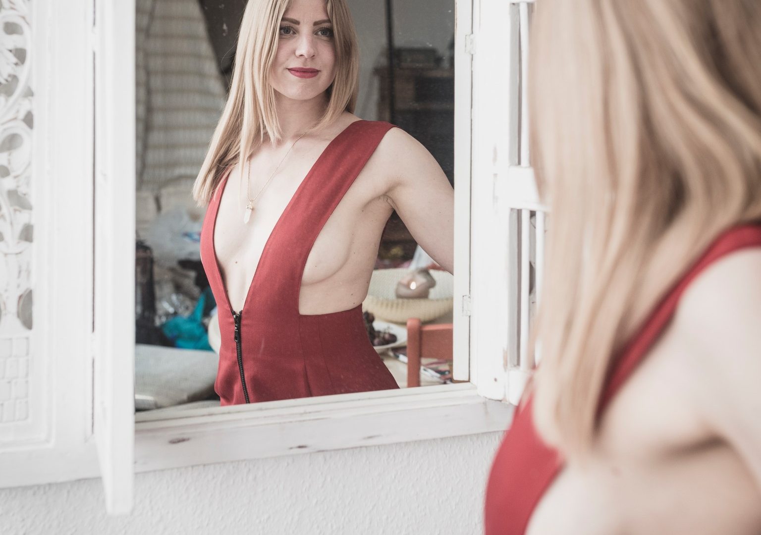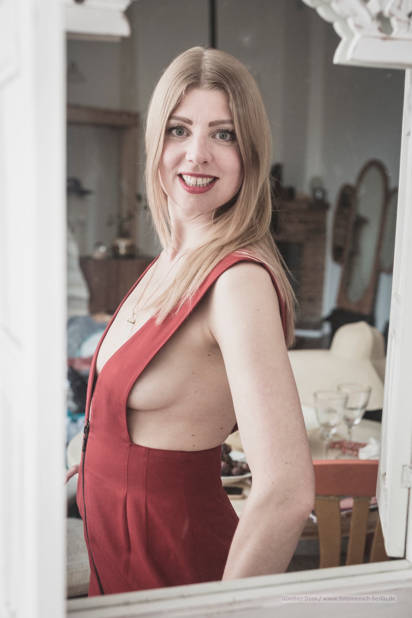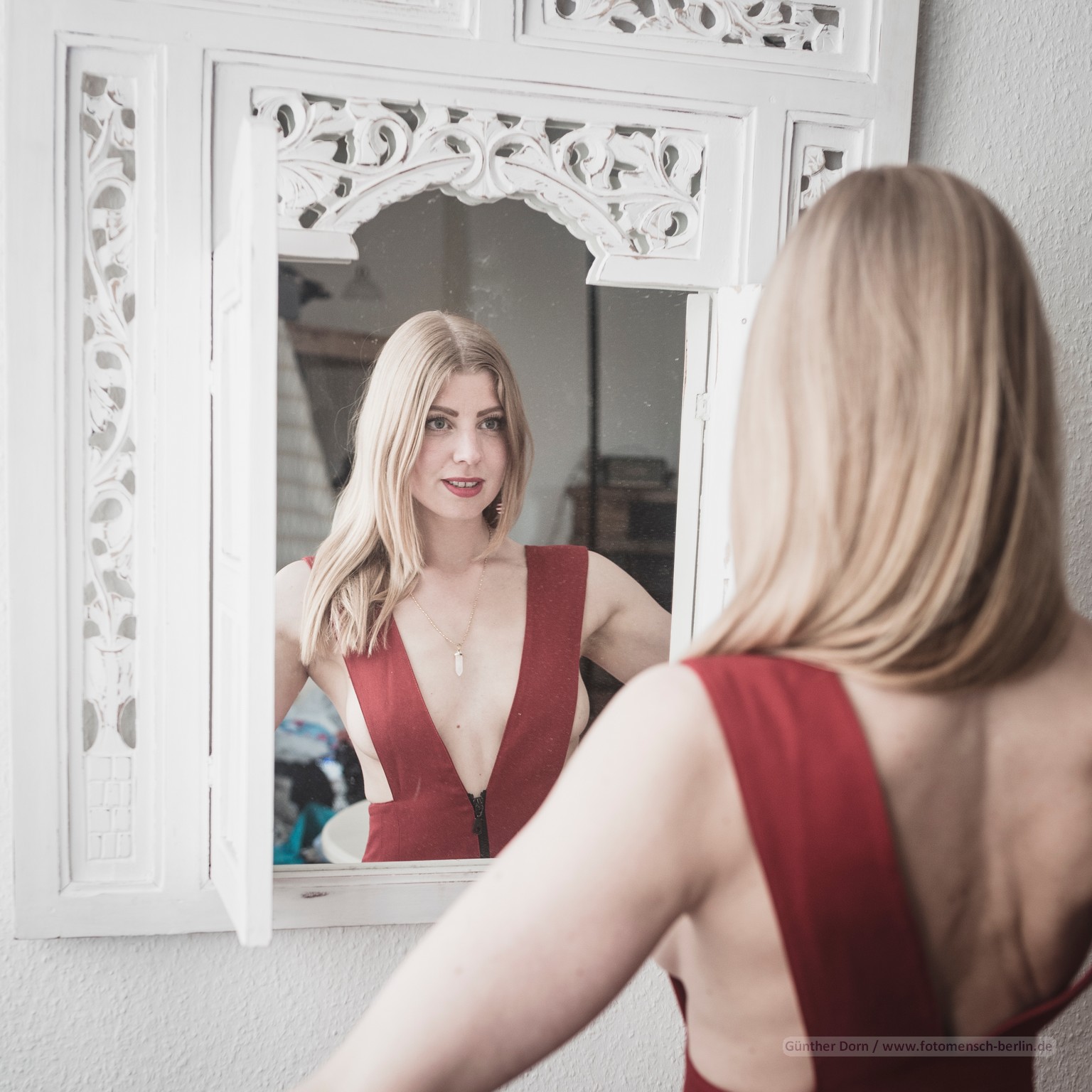 Katharina im roten Kleid schaut in den Spiegel Ähnliche Beiträge: Schau mich an Lucia, Fashion Michaela im weißen Kleid